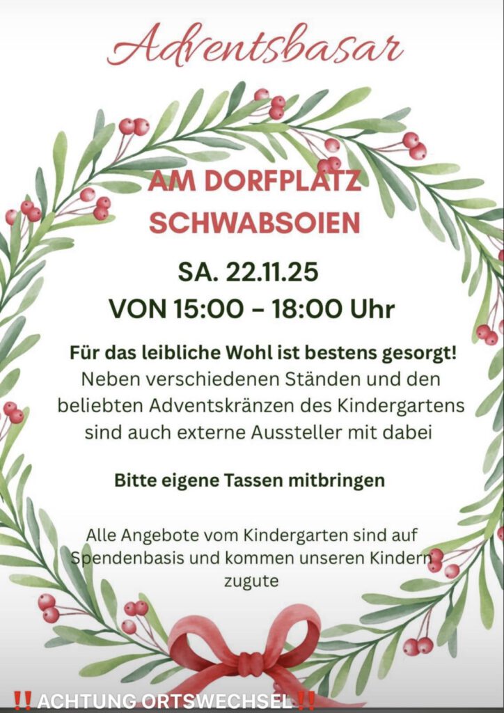 - Adventsbasar am 21.11. von 15-18 Uhr auf dem Dorfplatz in Schwabsoien