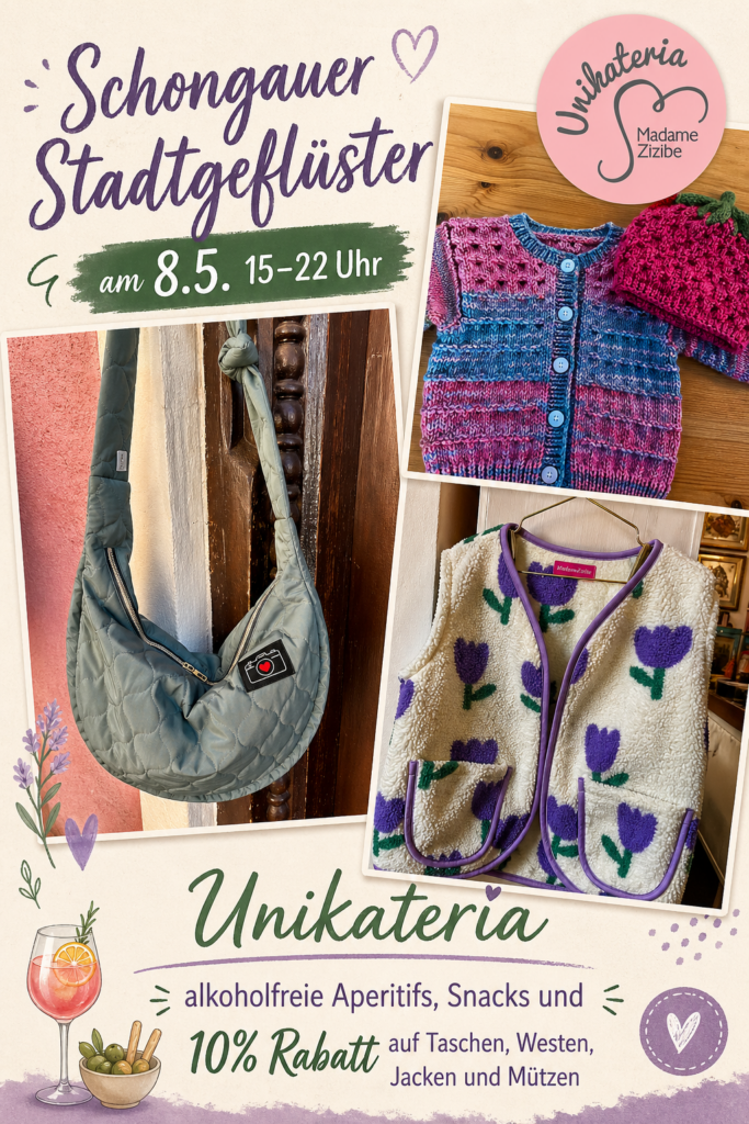 Bei uns in der Unikateria gibt es alkoholfreie Aperitifs, Snacks und 10% Rabatt auf Taschen, Westen, Jacken und Mützen